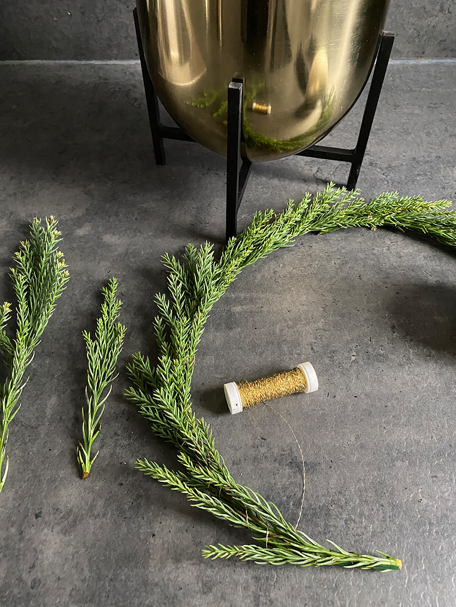 Da meine Adventsdekoration in jedem Jahr anders ausfallen soll, habe ich diesmal sehr minimalistisch gearbeitet und es gibt keinen typischen Adventskranz. Die beiden neuen Goldgefäße haben einen kleinen Kranz aus Cryptomeria-Grün und champagnerfarbenen Kugeln bekommen. Dazu noch einige schwarz lackierte Kiefernnadeln und Golddraht. In Kombination mit den schwarzen Leuchtern, goldenen Stumpenkerzen und den Raumduftkerzen von Byredo ist die Tischdeko fertig.