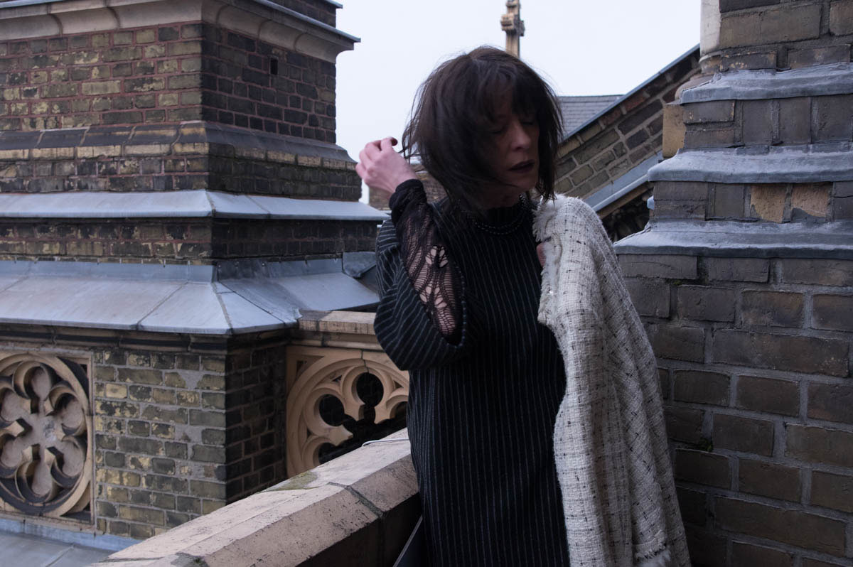 Outfit: Kleid, Hose und Boots: Zara, Netzpullover: Hemut Lang, Mantel: No Name, Tasche und Schal: Chanel