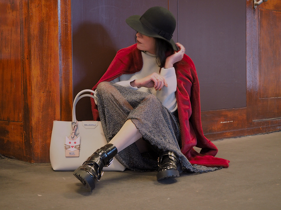 Den Mantel habe ich mit einem Rock von Atmosphere, dem langen Oversized Pulli von Edited, meiner hellgrauen Tasche mit dem roten Innenleben von Karl Lagerfeld und einem Hut von H&M kombiniert.